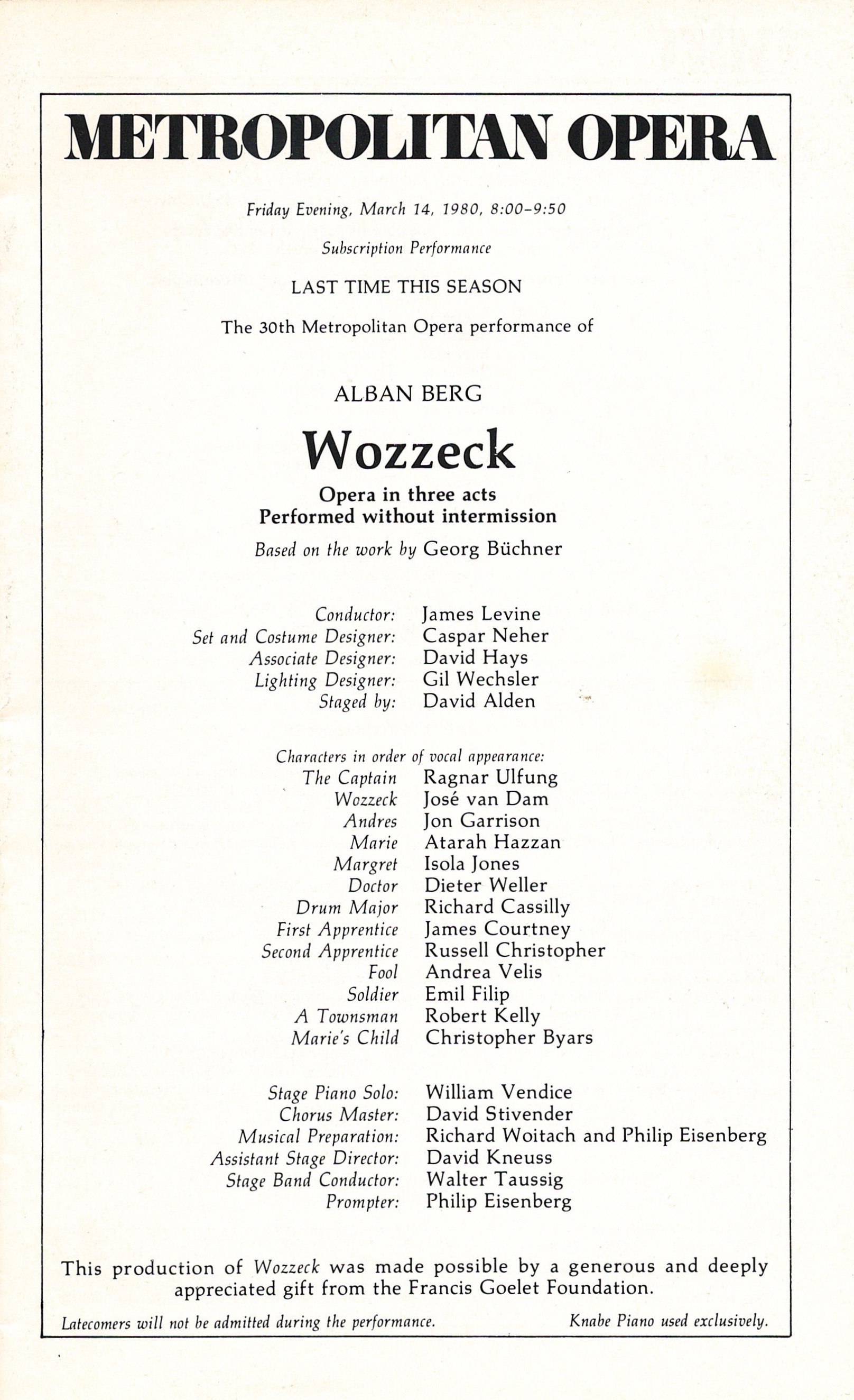 "Alice Tully attended this performance. Afterwards she came backstage to greet me in my dressing room, along with the president of the Board of the MET, and said the following: 'My friend told me that she had just seen the greatest Marie she had ever seen, and that I must come to see you.......and, she was right!'"