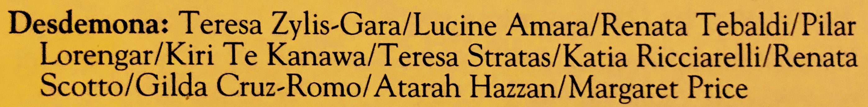 Desdemona: Teresa Zylis-Gara/Lucine Amara/Renata Tebaldi/Pilar Lorengar/Kiri Te Kanawa/Teresa Stratas/Katia Ricciarelli/Renata Scotto/Gilda Cruz-Romo/Atarah Hazzan/Margaret Price